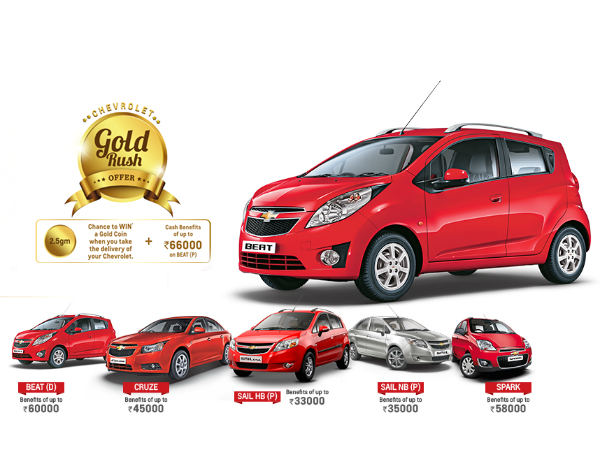 ഷെവര്ലെ ബീറ്റ് ഹാച്ച്ബാക്കിനാണ് മൊത്തം 66,000 രൂപയുടെ നേട്ടം വ്ഗാദാനം ചെയ്യുന്നത്. ഇതില് ഇന്ഷൂറന്സ്, കാഷ് ഡിസ്കൗണ്ട്, കോര്പറേറ്റ് ഡിസകൗണ്ട്, എക്സ്ചേഞ്ച് ബോണസ് തുടങ്ങിയ ഘടകങ്ങളുണ്ടാകാം. ഇതെക്കുറിച്ച് ഷെവര്ലെ സൈറ്റ് വിശദമായി പറയുന്നില്ല. ബീറ്റ് (പി) പതിപ്പിന് 66,000 രൂപയുടെ വാഗ്ദാനവും ബീറ്റ് (ഡി) പതിപ്പിന് 60,000 രൂപയുടെ വാഗ്ദാനവുമാണ് നല്കുന്നത്.