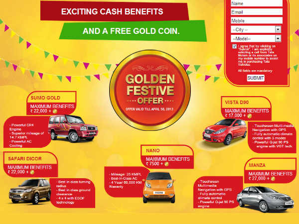 ഏപ്രില് മാസത്തില് വില്പന പിടിച്ചെടുക്കുക എന്ന ലക്ഷ്യത്തോടെ ഗോള്ഡന് ഫെസ്റ്റിവല് ഓഫര് പ്രഖ്യാപിച്ചിരിക്കുന്നു ടാറ്റ മോട്ടോഴ്സ്. ഏപ്രില് 30 വരെയാണ് ഓഫറുകളുടെ കാലാവധി. വിവിധ മോഡലുകളുടെ മേല് കാഷ് ഡിസ്കൗണ്ടും ഓരോ സ്വര്ണനാണയവുമാണ് പ്രഖ്യാപിച്ചിട്ടുള്ളത്
