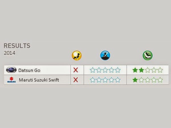 മാരുതി സുസൂക്കി സ്വിഫ്റ്റിന്റെ എല്എക്സ്ഐ പതിപ്പും ഡാറ്റ്സന് ഗോ ഹാച്ച്ബാക്കുമാണ് ഏറ്റവും പുതിയതായി ഗ്ലോബല് എന്സിഎപി ടെസ്റ്റ് ചെയ്തത്. മണിക്കൂറില് 64 കിലോമീറ്റര് വേഗതയിലായിരുന്നു ടെസ്റ്റ്. മുതിര്ന്നവര്ക്കുള്ള സുരക്ഷാ ക്രമീകരണങ്ങളുടെ കാര്യത്തില് ഡാറ്റ്സന് ഗോ പൂജ്യം റേറ്റിങ്ങാണ് നേടിയത്. കുട്ടികള്ക്കുള്ള സുരക്ഷയില് ടൂ സ്റ്റാര് റേറ്റിങ്ങും സ്വന്തമാക്കി. വാഹനത്തിന്റെ ദയനീയാവസ്ഥ ഇവിടെയും തീരുന്നില്ല. എയര്ബാഗുകള് നല്കിയാല് തന്നെയും ഈ കാറിലെ യാത്രക്കാര് രക്ഷപ്പെടാന് പോകുന്നില്ല എന്നാണ് ഗ്ലോബല് എന്സിഎപി നിരീക്ഷിച്ചത്. ആഘാതത്തെ ചെറുത്തുനില്ക്കാനുള്ള ബലം കാറിന്റെ നിര്മാണത്തിനുപയോഗിച്ച ദ്രവ്യങ്ങള്ക്കില്ല!
