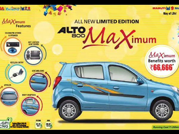 കീലെസ്സ് എന്ട്രി, ഇആകര്ഷകമായ ബോഡ് ഗ്രാഫിക്സ് തുടങ്ങി 66,666 രൂപയോളം വരുന്ന അധിക സന്നാഹങ്ങള് മാരുതി സുസൂക്കി ആള്ട്ടോ 800 മാക്സിമം പതിപ്പിലുണ്ട്.