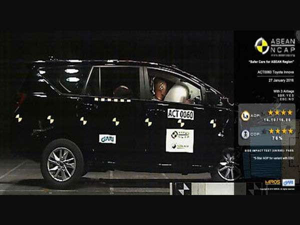 ആസിയാൻ എൻസിഎപി (New Car Assessment Program for Southeast Asian Countries) സംഘടിപ്പിച്ച ക്രാഷ് ടെസ്റ്റിൽ ടൊയോട്ട ഇന്നോവ ക്രിസ്റ്റയ്ക്ക് ഫോർ സ്റ്റാർ റേറ്റിംഗാണ് ലഭിച്ചത്. ഇലക്ട്രോണിക് സ്റ്റബിലിറ്റി (ഇഎസ്സി) കൺട്രോൾ ഉൾപ്പെടുത്താത്ത ക്രിസ്റ്റയുടെ ബേസ് വേരിയന്റിലാണ് ക്രാഷ് ടെസ്റ്റ് നടത്തിയത്. ഇഎസ്സി ഇല്ല എന്ന ഒറ്റക്കാരണത്താലാണ് ക്രിസ്റ്റയിക്ക് ഫൈവ് സ്റ്റാർ കിട്ടാതെ പോയത്.