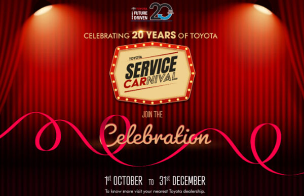 ഒക്ടോബർ ഒന്നു മുതൽ 2019 ഡിസംബർ 31 വരെയാണ് ടൊയോട്ട സർവ്വീസ് മെയിന്റനൻസ് ഓഫറുകൾ വാഗ്ദാനം ചെയ്യുന്നത്. രാജ്യത്ത് 20 വർഷത്തെ സേവനം പൂർത്തിയാക്കിയതിന്റെ ഭാഗമായാണ് കമ്പനി മൂന്ന് മാസത്തെ സർവ്വീസ് കാർണിവൽ പ്രഖ്യാപിച്ചിരിക്കുന്നത്. 1999-ലാണ് ജാപ്പനീസ് വാഹന നിർമാതാക്കളായ ടൊയോട്ട ഇന്ത്യയിൽ വിപണിയിൽ പ്രവർത്തനം ആരംഭിച്ചത്.