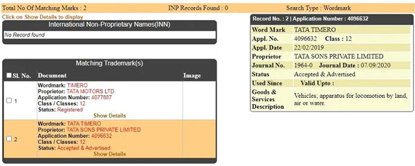 ടാറ്റ മോട്ടോർസ് അടുത്തിടെ ഇന്ത്യയിൽ 'ടാറ്റ ടൈമറോ' എന്ന പേര് ട്രേഡ്മാർക്ക് ചെയ്തു. വാണിജ്യ വ്യവസായ മന്ത്രാലയത്തിന്റെ ഡാറ്റാബേസിൽ കമ്പനി കഴിഞ്ഞ വർഷം ട്രേഡ്മാർക്കിനായി അപേക്ഷ നൽകിയതായും 2020 സെപ്റ്റംബറിൽ ഇത് അംഗീകരിച്ചതായും വെളിപ്പെടുത്തുന്നു.