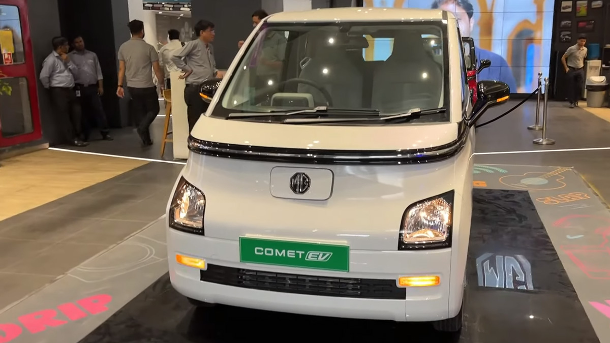 ഹെഡ്ലാമ്പുകൾക്ക് താഴെയുള്ള ടേൺ ഇൻഡിക്കേറ്ററുകൾ പോലും ഹാലജൻ യൂണിറ്റുകളാണ്. കൂറ്റൻ വിൻഡ്സ്ക്രീനിന് താഴെയുള്ള ഫ്രണ്ട് പ്രൊഫൈലിന്റെ വീതി കവർ ചെയ്തിരുന്ന ടോപ്പ് സ്പെക്ക് മോഡലിലെ ഡേ ടൈം റണ്ണിംഗ് എൽഇഡി സ്ട്രിപ്പ് ഇതിൽ ഒരു ക്രോം സ്ട്രിപ്പ് ഉപയോഗിച്ച് കമ്പനി മാറ്റിസ്ഥാപിക്കുന്നു. എംജി കോമെറ്റ് ഇവി പേസ് വേരിയന്റിന്റെ സൈഡ് പ്രൊഫൈലിന് ഹൈ സ്പെക് വേരിയന്റുകളിലേതുപോലെ ബ്ലാക്ക് വീൽ ക്യാപ്പുകളുള്ള സ്റ്റീൽ വീലുകളിൽ 12 ഇഞ്ച് ടയറുകൾ തന്നെയാണ് ലഭിക്കുന്നത്.