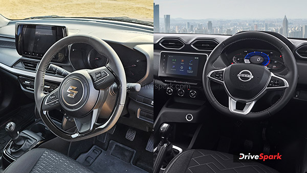 നിസ്സാൻ മാഗ്നൈറ്റുമായി താരതമ്യപ്പെടുത്തുമ്പോൾ മൊത്തത്തിലുള്ള അളവുകളിൽ ന്യൂ-ജെൻ സ്വിഫ്റ്റ് ചെറുതാണെന്നെ പറയാൻ സാധിക്കു, പക്ഷേ എസ്യുവി ആയതിനാൽ സ്വിഫ്റ്റിനേക്കാൾ നീളമുള്ള വീൽബേസും മികച്ച ഗ്രൗണ്ട് ക്ലിയറൻസും മാഗ്നൈറ്റിനുണ്ട് എന്നും മനസിലാക്കുക. മറ്റൊരു കാര്യം എന്താണെന്ന് വച്ചാൽ സ്വിഫ്റ്റും മാഗ്നൈറ്റും ഫീച്ചറുകളുടെ കാര്യത്തിൽ ഒന്നിനൊന്ന് മെച്ചമാണ്. രണ്ട് മോഡലിലും ക്രൂയിസ് കൺട്രോൾ, ഓട്ടോമാറ്റിക് ക്ലൈമറ്റ് കൺട്രോൾ, എൽഇഡി ഹെഡ്ലൈറ്റുകൾ, 16 ഇഞ്ച് അലോയ് വീലുകൾ എന്നിവ ലഭിക്കുന്നുണ്ട്.