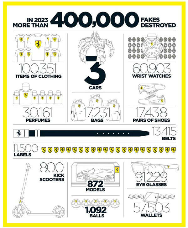ഇതിൽ ഒരു ലക്ഷത്തിലധികം വസ്ത്രങ്ങൾ, 30,161 വ്യാജ പെർഫ്യൂമുകൾ, ഏകദേശം 91,000 വ്യാജ കണ്ണടകൾ, ഏകദേശം 61,000 വ്യാജ റിസ്റ്റ് വാച്ചുകൾ, 17,438 വ്യാജ ഷൂകൾ, 13,000 വ്യാജ ബെൽറ്റുകൾ, 872 വ്യാജ സ്കെയിൽ മോഡലുകൾ, കൂടാതെ 57,000 ലധികം വാലറ്റുകൾ എന്നിവ ഉൾപ്പെടുന്നു. എന്നാൽ അതിലും വലിയ തമാശ എന്താണെന്ന് വച്ചാൽ മൂന്ന് ഫെരാരി വ്യാജ കാറുകളും പിടിച്ചെടുത്ത് നശിപ്പിക്കുകയും ചെയ്തു എന്നതാണ്. എങ്ങനെയാണ് ഈ വ്യാജ കാറുകൾ കണ്ടെത്തിയത്, എവിടെ നിന്നാണ് പിടിച്ചെടുത്തത് എന്നതിനെ കുറിച്ച് കമ്പനി പുറത്ത് വിട്ടിട്ടില്ല.