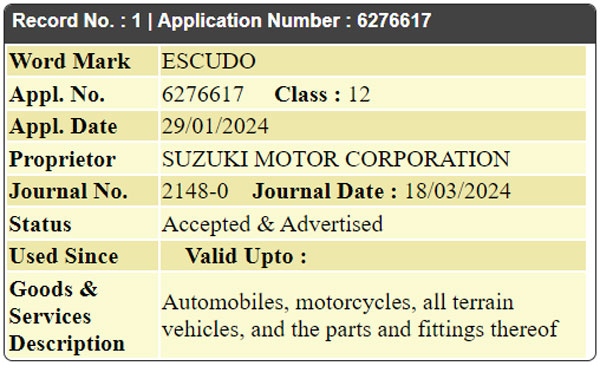 വരാനിരിക്കുന്ന മാരുതി സുസുക്കി മോഡലുകളിൽ ഇവ കമ്പനി ഉപയോഗിച്ചേക്കാം എന്ന ഊഹാപോഹങ്ങൾ ഇത് ഉയർത്തുന്നു. ട്രേഡ്മാർക്കുകൾ 2024 ജനുവരിയിൽ ഫയൽ ചെയ്യുകയും ഈ മാസം അംഗീകരിക്കുകയും ചെയ്തു എന്ന് റിപ്പോർട്ടുകൾ വ്യക്തമാക്കുന്നു. ഈ ട്രേഡ്മാർക്കുകളുടെ കൃത്യമായ ഉദ്ദേശ്യം ഇതുവരെ നിർ്മ്മാതാക്കൾ സ്ഥിരീകരിച്ചിട്ടില്ല എങ്കിലും, വരാനിരിക്കുന്ന മാരുതി എസ്യുവിക്ക് സുസുക്കി എസ്കുഡോ എന്ന പേര് ഉപയോഗിച്ചേക്കും എന്ന് പ്രതീക്ഷിക്കുന്നു.