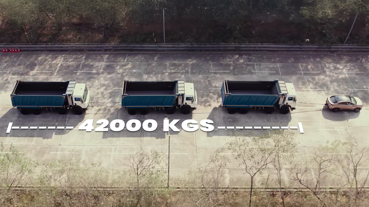 ടാറ്റ മോട്ടോർസ് തന്നെയാണ് അവരുടെ പേജിൽ വീഡിയോ പങ്കുവച്ചത്. ഒരു ടാറ്റ കർവ്വ് 42,000 കിലോഗ്രാമിന് തുല്യമായ മൂന്ന് ട്രക്കുകൾ വലിച്ചുകൊണ്ട് പോകുന്നത് കാണാം. ഓരോ ട്രക്കിനും 14,000 കിലോഗ്രാം ഭാരമുണ്ട് എന്നാണ് വീഡിയോയിൽ കാണിക്കുന്നു, കൂപ്പെ എസ്യുവിക്ക് ഇവയെ ഒരുമിച്ച് വലിക്കാൻ കഴിയുമെന്ന വീഡിയോയിൽ നിന്ന് മനസിലാകുന്നുണ്ട്. പിന്നിൽ പാർക്ക് ചെയ്തിരിക്കുന്ന ട്രക്കിലേക്ക് എസ്യുവി വലിച്ചിടുന്ന കനത്ത ചങ്ങലകൾ വീഡിയോയുടെ തുടക്കത്തിൽ നമുക്ക് കാണാം.