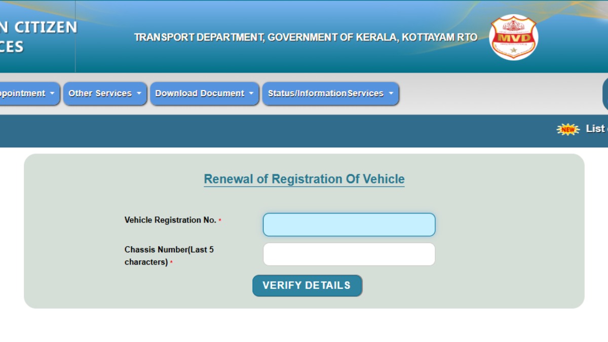 ശേഷം രജിസ്ട്രേഷന് നമ്പറും ഷാസി നമ്പറും പോലുള്ള ആവശ്യമായ വിവരങ്ങള് നല്കുക. അപേക്ഷാ പ്രക്രിയ പൂര്ത്തിയാക്കാന് 'വെരിെൈഫ ഡീറ്റെയില്സ്' എന്നതില് ക്ലിക്ക് ചെയ്യുന്നതോടെ നിങ്ങളുടെ ആർസി പുതുക്കുന്നതിനുള്ള അപേക്ഷ ഓൺലൈനായി പൂർത്തിയായി എന്നാണ്. പക്ഷേ ഓഫ്ലൈനായി വാഹനത്തിൻ്റെ ആർസി പുതുക്കാൻ അപേക്ഷിക്കണമെങ്കിൽ നിങ്ങളുടെ ജില്ലയിലെ ആർടിഒ ഓഫിൽ നേരിട്ട് ചെന്ന് അപേക്ഷ വാങ്ങി പൂരിപ്പിച്ച് നൽകുക.