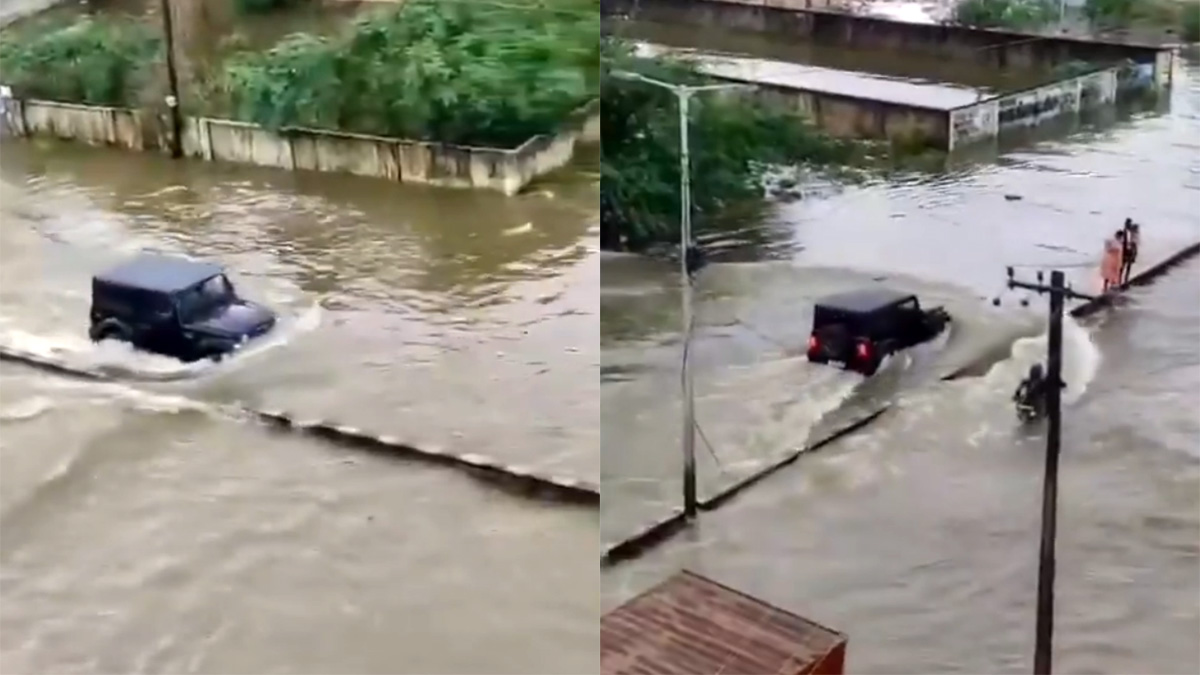 ലോറി പോലുള്ള വലിയ വാഹനങ്ങള് മാത്രം കടന്നുപോകുന്ന ഇരുവശവും വെള്ളംനിറഞ്ഞ റോഡിലൂടെ കൂളായിട്ടാണ് ഥാര് കടന്ന് പോകുന്നത്. വണ്ടിയുടെ ഹെഡ്ലാമ്പുകളും ഗ്രില്ലും പൂര്ണമായും വെള്ളത്തിലായിരുന്നു. ഥാറില് ഒരു സ്നോര്ക്കല് സജ്ജീകരിച്ചിരിക്കുന്നതായി തോന്നുന്നില്ല. 650 mm ആണ് മഹീന്ദ്ര ഥാറിന്റെ വാട്ടര് വേഡിംഗ് കപ്പാസിറ്റി.