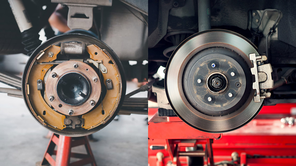 ഡ്രം ബ്രേക്കുകളിൽ ബ്രേക്ക് ഷൂകൾ അടങ്ങിയ ഒരു റൗണ്ട് ഡ്രം പോലെയുള്ള ഭാഗമാണുളളത്. ബ്രേക്ക് പെഡൽ അമർത്തുമ്പോൾ, ഹൈഡ്രോളിക് മർദ്ദം ഷൂസ് ഡ്രമ്മിന്റെ ആന്തരിക ഉപരിതലത്തിൽ വികസിക്കാൻ സമ്മർദ്ദം ചെലുത്തുകയും ഘർഷണം സൃഷ്ടിക്കുകയും ചക്രത്തിന്റെ കറക്കം മന്ദഗതിയിലാക്കുകയും ചെയ്യുന്നു. മറുവശത്ത്, ഡിസ്ക് ബ്രേക്കുകൾ വീൽ ഹബിൽ ഘടിപ്പിച്ചിരിക്കുന്ന ഒരു ഫ്ലാറ്റ് റോട്ടർ ഉപയോഗിക്കുന്നു. ബ്രേക്ക് പെഡലിൽ സമ്മർദ്ദം ചെലുത്തുമ്പോൾ, ഹൈഡ്രോളിക് കാലിപ്പറുകൾ ഘർഷണം സൃഷ്ടിക്കുന്നതിനായി ബ്രേക്ക് പാഡുകൾ റോട്ടറിന്റെ ഇരുവശത്തേക്കും ഞെരുക്കുന്നു.