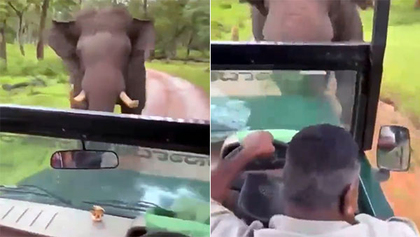 സ്കില് എന്നാല് ഇതാണ്; കുത്താന് പാഞ്ഞ കൊമ്പനെ റിവേഴ്സ് അടിച്ച് തോല്പിച്ച് സഫാരി ജീപ്പ് ഡ്രൈവര്