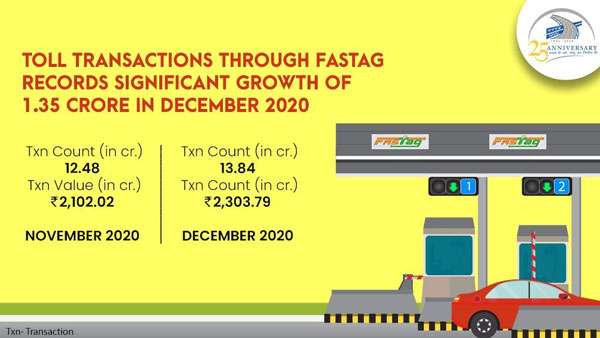 2020 നവംബറില് 2,102 കോടി രൂപയില് നിന്ന് ഡിസംബറില് ഫാസ്ടാഗ് വഴിയുള്ള ടോള് ശേഖരം 201 കോടിയിലധികം വര്ധിച്ച് 2,303.79 കോടി രൂപയായി ഉയര്ന്നുവെന്ന് നാഷണല് ഹൈവേ അതോറിറ്റി ഓഫ് ഇന്ത്യ (NHAI) പ്രസ്താവനയില് പറഞ്ഞു.