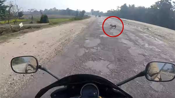 അത്തരത്തിലൊരു സംഭവമാണ് താഴെ വീഡിയോയില് നല്കിയിരിക്കുന്നത്. യാത്രയ്ക്കിടയില് റോഡിന് കുറുകെ ചാടുന്ന നായയാണ് വീഡിയോയിലുള്ളത്. ആളൊഴിഞ്ഞ റോഡായ കാരണം അത്യാവശ്യം വേഗത്തില് പോവുകയായിരുന്നു വീഡിയോയിലെ ഹോണ്ട CBR250R റൈഡര്.
