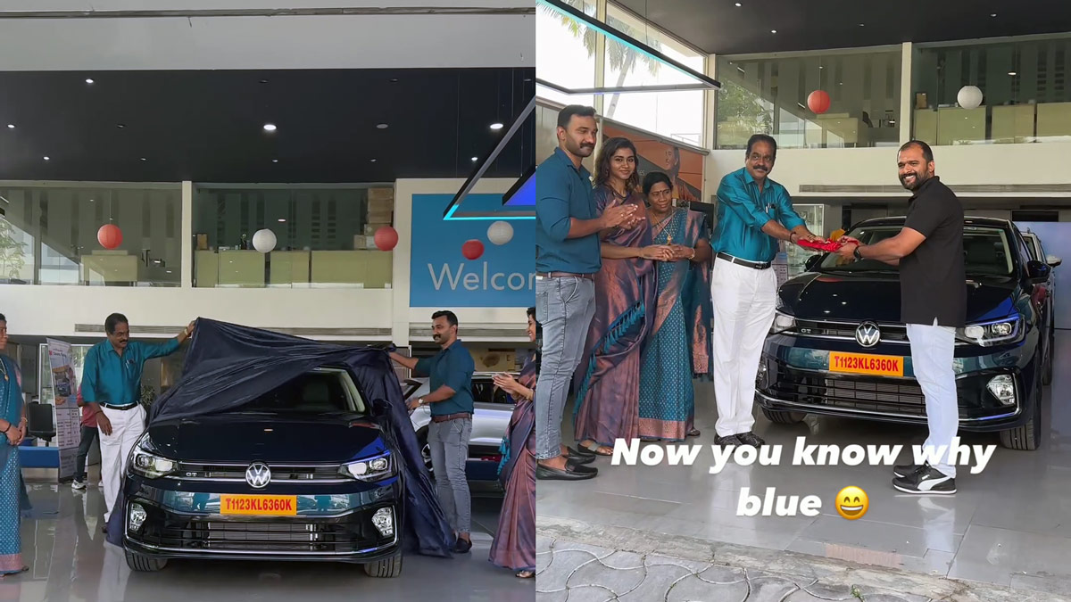 തിരുവനന്തപുരം സ്വദേശിയായ ഒരു പിതാവ്, തങ്ങളുടെ പുത്തൻ ഫോക്സ്വാഗൺ വിർട്ടസിന്റെ ഡെലിവറിയ്ക്ക് കുടുംബത്തിലെ എല്ലാവരെയും നീല നിറത്തിലുള്ള വസ്ത്രം ധരിപ്പിച്ച് എത്തിയതാണ് ഈ വീഡിയോയെ കൗതുകമാക്കുന്നത്. ഇദ്ദേഹത്തിന്റെ മകൾ ശ്രീലക്ഷ്മി തന്റെ ഇൻസ്റ്റഗ്രാം പേജിലൂടെയാണ് വീഡിയോ പങ്കുവെച്ചത്. ഈ വീഡിയോയിൽ, തങ്ങളുടെ പുതിയ ഫോക്സ്വാഗൺ വിർട്ടസ് ബ്ലൂ ഷെയ്ഡിന്റെ ഡെലിവറിയ്ക്കായി തന്റെ പിതാവ് എല്ലാവരേയും നീല നിറത്തിലുള്ള വസ്ത്രം ധരിക്കാൻ പ്രേരിപ്പിച്ചതായി സോഷ്യൽ മീഡിയ ഇൻഫ്ല്യുവൻസർ പങ്കുവെയ്ക്കുന്നു.