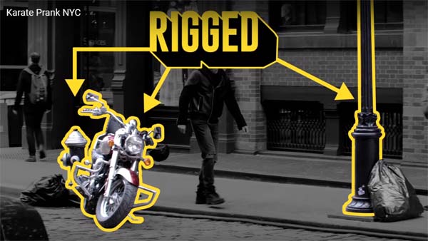 ഇത്തരത്തിലുള്ള നിർമ്മിതികളാണ് വീഡിയോയിലുള്ള ക്രൂയിസർ ബൈക്കും വൈദ്യുത പോസ്റ്റുമെല്ലാം.സംഭവം ഇങ്ങനെയാണ്, തിരക്കുള്ള ന്യൂയോർക്ക് നഗരത്തിലെ മൂന്ന് വ്യത്യസ്ത ഭാഗങ്ങളിൽ രണ്ട് നടന്മാർ നടത്തുന്ന പ്രാങ്ക് ആണ് വീഡിയോയിൽ.