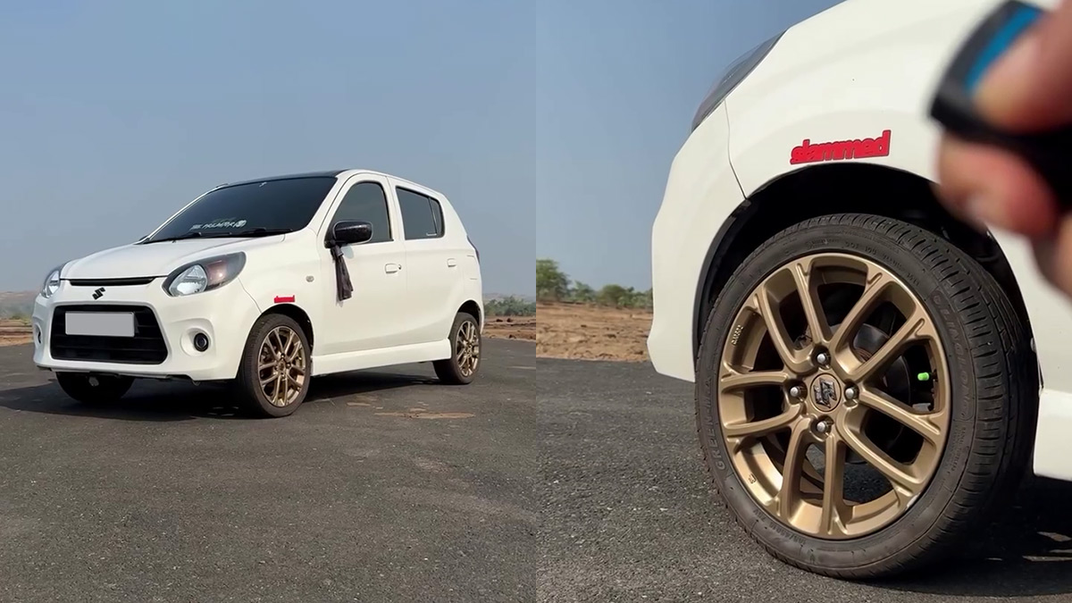 മാരുതി സ്വിഫ്റ്റിൽ നിന്നുള്ള 15 ഇഞ്ച് അലോയ് വീലുകളാണ് ആൾട്ടോയ്ക്ക് നൽകിയിരിക്കുന്നത്. ലഭിക്കുന്നു. അതോടൊപ്പം തന്നെ മികച്ച ഫ്ലോ എയർ ഫിൽട്ടറും അനിയന്ത്രിതമായ എക്സ്ഹോസ്റ്റും ഉണ്ട്. ഈ ആൾട്ടോയിലെ എയർ ബാഗ് സസ്പെൻഷൻ സജ്ജീകരണം കേരളത്തിലെ എയർ 1 കസ്റ്റംസ് എന്ന ബ്രാൻഡ് ആണ് ഘടിപ്പിച്ചിരിക്കുന്നത്. ഇതിന് ഏകദേശം 1.5 ലക്ഷം രൂപ വിലവരും.