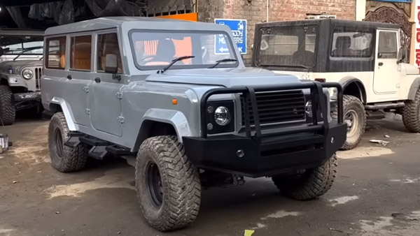 പിന്നിലെ ടെയിൽഗേറ്റും മനോഹരമായി എക്സിക്യൂട്ട് ചെയ്തിട്ടുണ്ട്. നീളമുള്ള ബോഡി ഷെൽ ബലേറോയുടെ അതേ സബ് ഫോർ മീറ്റർ ഫ്രെയിമിൽ സെറ്റ് ചെയ്തിരിക്കുന്നു, അത് ഒട്ടും അരോചകമായി കാണപ്പെടുന്നില്ല. ഇവയെല്ലാം ഒത്തുചേർന്ന് വളരെ കൺവിൻസിംഗായ ഒരു കസ്റ്റം ലാൻഡ് റോവർ ഡിഫെൻഡർ 110 നിർമ്മിക്കുന്നു. ഇന്റീരിയറുകൾ ടാൻ ലെതറെറ്റ് കൊണ്ട് പൊതിഞ്ഞിരിക്കുന്നു, എഞ്ചിൻ സ്റ്റോക്ക് കണ്ടീഷനിൽ സൂക്ഷിച്ചിരിക്കുന്നു.