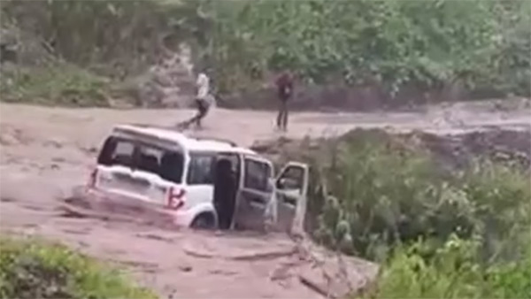 കാർ യാത്രക്കാർ അവസാന നിമിഷം കാർ ഉപേക്ഷിക്കുന്നു. വെളളം ഒഴുകി വരുന്നതിൻ്റെ ഒരു വശത്ത് നിന്ന് എടുത്ത വീഡിയോയിൽ, അതിവേഗം ഒഴുകുന്ന അരുവിയുടെ നടുവിൽ ഒരു മഹീന്ദ്ര സ്കോർപ്പിയോ ക്ലാസിക്ക് കൂടുതൽ മുന്നോട്ട് പോകാൻ പാടുപെടുന്നത് വ്യക്തമായ കാണാം.