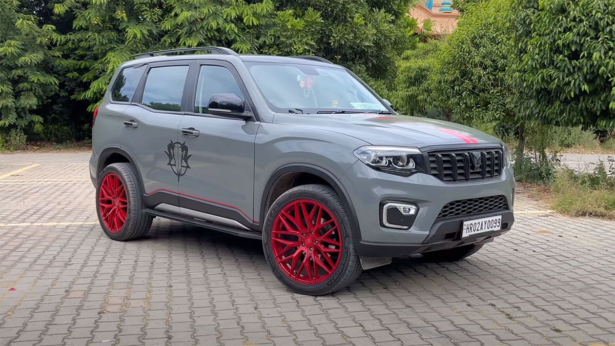 അത്തരത്തിലുള്ള ഒരു കറുത്ത സ്കോർപ്പിയോ-എൻ-ന്റെ ഉടമ തന്റെ എസ്യുവി ഒരു നാർഡോ ഗ്രേ റാപ്പ് ജോബ് ഉപയോഗിച്ച് കസ്റ്റമൈസ് ചെയ്തിരിക്കുകയാണ്, ഒപ്പം വലിയ 22 ഇഞ്ച് അലോയ് വീലുകളും ചേർത്ത് മോഡിഫൈ ചെയ്തിരിക്കുന്നത്. ഈ മഹീന്ദ്ര സ്കോർപ്പിയോ-എൻ-ലെ നാർഡോ ഗ്രേ റാപ്പ് ചെയ്തിരിക്കുന്നത് രാജ്യത്ത് ഇത്തരത്തിലുള്ള ആദ്യത്തെ മോഡലാണ്. ബോഡി പാനലുകൾ മറയ്ക്കുന്ന ഒരു നാർഡോ ഗ്രേ റാപ്പിനൊപ്പം, SUV യിൽ കോൺട്രാസ്റ്റിംഗ് റെഡ് സ്ട്രൈപ്പുകളും സ്കോർപിയോ-N ന്റെ ബോണറ്റിൽ "69" എന്ന നമ്പറും നൽകിയിട്ടുണ്ട്.