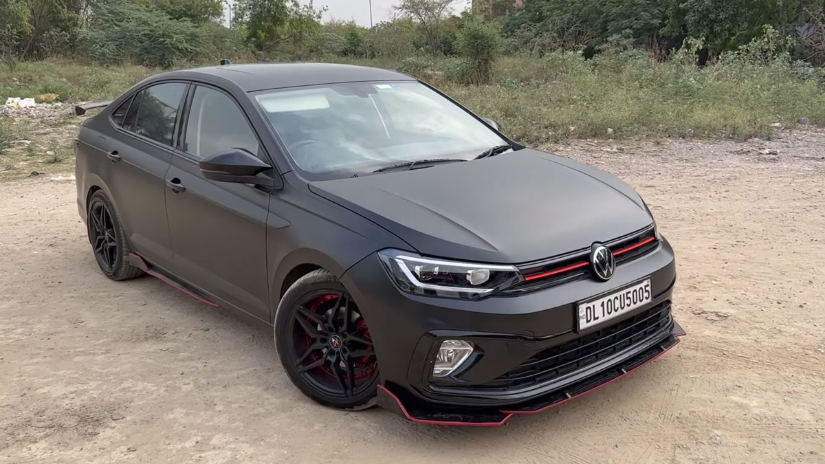 Virtus 1.0 TSI ടോപ്പ്-ലൈൻ വേരിയൻ്റ് മുഴുവനായി തന്നെ കസ്റ്റമൈസ് ചെയ്തിരിക്കുകയാണ്. സാറ്റിൻ ബ്ലാക്കിലാണ് കാർ മുഴുവനായി വ്റാപ്പ് ചെയ്തിരിക്കുന്നത്. വാഹനത്തിൻ്റെ ശരിയായ നിറമെന്ന് പറയുന്നത് കാർബൺ സ്റ്റീൽ ഗ്രേയാണ്. കാറിന് സ്പോർട്ടി ലുക്ക് ലഭിക്കുന്നതിനായി ചുവന്ന പിൻസ്ട്രിപ്പിംഗോടുകൂടിയ ത്രീ-പീസ് യൂണിവേഴ്സൽ ഫ്രണ്ട് സ്പ്ലിറ്റർ ചേർത്തിരിക്കുന്നു. മുൻവശത്തെ ഫോഗ് ലാമ്പുകളിലും ഹെഡ്ലൈറ്റുകളുടെ ത്രോ വർദ്ധിപ്പിക്കുന്നതിനായി 120 വാട്ട് എൽഇഡി ലൈറ്റുകൾ ചേർത്തിട്ടുണ്ട്.