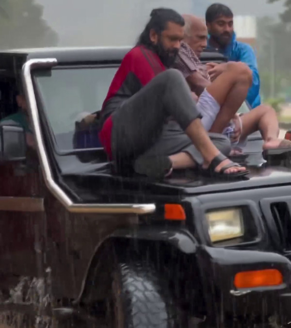 മഹീന്ദ്ര ബൊലേറോയുടെ വിൻഡോ ലൈൻ വരെ വെള്ളം കയറിയിട്ടുണ്ട്. വെള്ളം ക്യാബിനിലേക്ക് കയറിയെങ്കിലും ഇത് വളരെ കുറച്ച് ഇലക്ട്രോണിക്സ് ഉള്ള വളരെ പഴയ മോഡലായതിനാൽ, ഉടമയ്ക്ക് പ്രശ്നങ്ങളൊന്നും നേരിടേണ്ടി വന്നിട്ടില്ല. അവൻ അനായാസമായി എസ്യുവി ഓടിക്കുന്നുണ്ട്. ബൊലേറോ ഓടിച്ച് വീട്ടിലെത്തുകയും അവിടെ താമസിക്കുന്നവരെ രക്ഷിക്കുകയും ചെയ്യുന്നുണ്ട്. വെള്ളത്തിന് ആഴം കൂടിയതിനാൽ എസ്യുവിയുടെ മേൽക്കൂരയിലും ബോണറ്റിലും താമസക്കാരെ ഇരുത്തി റോഡിലേയ്ക്കെത്തിച്ചു.