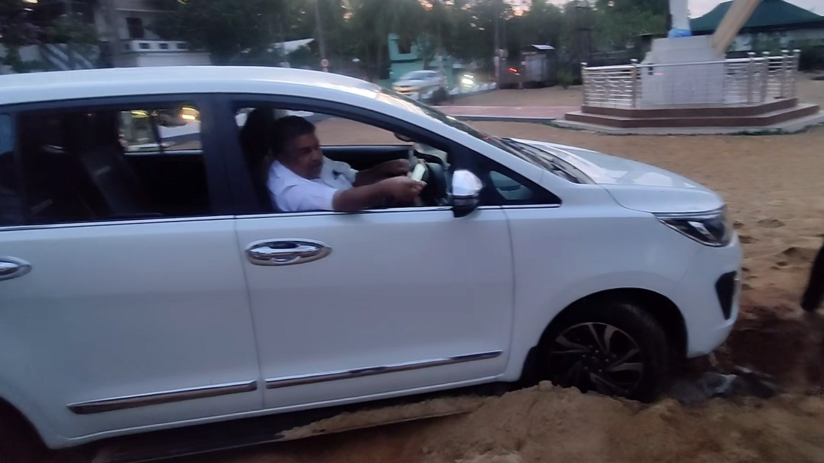 വാഹനത്തിൻ്റെ മുൻവശത്തെ ടയർ മണലിൽ കിടന്ന് കറങ്ങുകയായിരുന്നു. തൻ്റെ പഴയ ഡ്രൈവിങ്ങ് സ്കിൽ ഒന്ന് പരീക്ഷിച്ചു കളയാം എന്ന് പറഞ്ഞ് മന്ത്രി ഡ്രൈവിങ്ങ് സീറ്റിലേക്ക് കയറിയിരുന്നപ്പോൾ എല്ലാവർക്കും കൗതുകമായി. എല്ലാവരു കൂടെ വാഹനത്തിൻ്റെ മുൻവശത്ത് നിന്ന് പിന്നിലേക്ക് തളളിയെങ്കിലും കാർ കൂടുതൽ മണലിലേക്ക് ഇറങ്ങി പോയി. വാഹനത്തിൻ്റെ മുൻവശത്തെ ടയറിൻ്റെ അടിയിൽ കല്ലും, മണ്ണുമെല്ലാം ഇടാൻ മന്ത്രിയുടെ നിർദേശം.