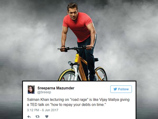 സമയബന്ധിതമായി വായ്പ തിരിച്ചടക്കുന്നതില് പ്രഭാഷണം മുഴക്കുന്ന വിജയ് മല്യയ്ക്ക് തുല്യമാണ് റോഡ് സുരക്ഷയെ പറ്റിയുള്ള സല്മാന് ഖാന് പരാമര്ശമെന്ന് ചില ട്വീറ്റുകള് പറയുന്നു.
