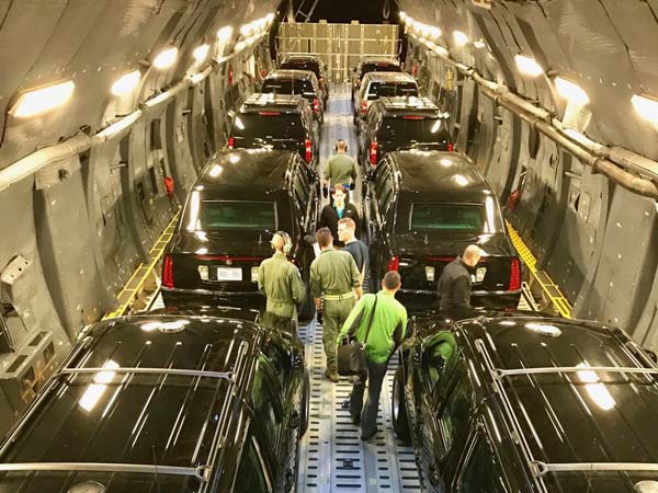 സര്വ്വ സന്നാഹങ്ങളോടെയുമുള്ള ട്രംപിന്റെ വാഹനവ്യൂഹങ്ങളെ ചിത്രം വെളിപ്പെടുത്തുന്നു. ട്രംപിന് വേണ്ടി ഭീമാകരമായ C-17 ഗ്ലോബ്മാസ്റ്റര് വിമാനത്തില് പുറപ്പെട്ട വാഹനവ്യൂഹത്തിന്െ ചിത്രങ്ങള് രഹസ്യ സുരക്ഷാ വിഭാഗമാണ് ട്വിറ്ററിലൂടെ പുറത്ത് വിട്ടത്.