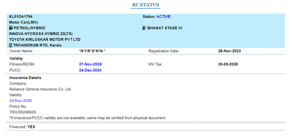 ഏറെ കുറെ 38.66 ലക്ഷം രൂപയോളം വില വരുന്ന ഈ കാർ വെറും നാല് മാസം മുമ്പ്, അതായത് 2023 നവംബർ 28 -നാണ് രജിസ്റ്റർ ചെയ്തിരിക്കുന്നത്. ഫിനാൻസ് ഓപ്ഷനോടെയാണ് ഈ ഇന്നോവ ഹൈക്രോസ് സ്വന്തമാക്കിയിരിക്കുന്നത് എന്ന് വെബ്ബിൽ നിന്നും കിട്ടുന്ന വിവരങ്ങൾ വ്യക്തമാക്കുന്നു. ഈ കേടുപാടുകൾക്കുള്ള അറ്റകുറ്റം തീർക്കാൻ വേണ്ടുന്ന തുക ഉടമയ്ക്ക് ഇൻഷുറൻസിലൂടെ കിട്ടും എന്നാണ് ഞങ്ങൾ വിശ്വസിക്കുന്നത്.