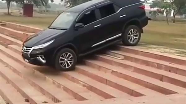 പടിക്കെട്ട് വളരെ അനായാസകരമായി ഇറങ്ങുന്ന ഫോര്ച്യൂണറിനെയാണ് തുടക്കത്തില് കാണാനാവുന്നത്. താഴേക്കിറങ്ങുമ്പോള് പടിക്കെട്ടിന്റെ ചില ഭാഗങ്ങള് അടര്ന്ന് പോയെങ്കിലും മുന് ബമ്പറിന്റെയോ പിന് ബമ്പറിന്റെയോ അടിവശം പടികളില് ഒന്ന് തട്ടുക പോലും ചെയ്തില്ല.