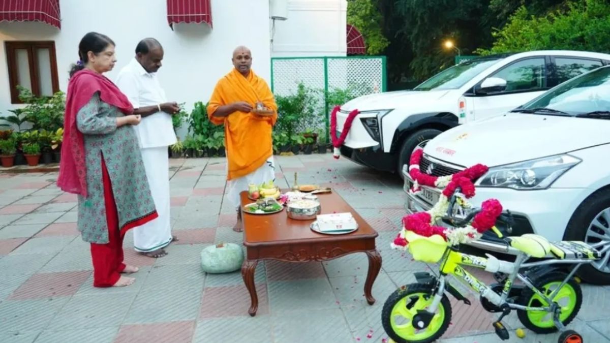 എച്ച്ഡി കുമാരസ്വാമി അടുത്തിടെ തന്റെ വാഹനങ്ങള്ക്ക് വാഹന പൂജ നടത്തുന്ന ചിത്രങ്ങള് സോഷ്യല് മീഡിയ അക്കൗണ്ടുകളില് പങ്കുവെച്ചിരുന്നു. ഈ ചിത്രങ്ങളിലും റീലുകളിലും ഏറെ ശ്രദ്ധയാകര്ഷിച്ച ഒരു വാഹനം മഹീന്ദ്ര XUV.e9 ആയിരുന്നു. ഡല്ഹിയിലെ ഔദ്യോഗിക വസതിയുടെ പൂമുഖത്ത് ഭാര്യയോടൊപ്പം കുമാരസ്വാമി നില്ക്കുന്നതാണ് വീഡിയോയിലുള്ളത്. ഒരു പൂജാരി വാഹനങ്ങള്ക്ക് പൂജ നടത്തുന്നുണ്ടായിരുന്നു. നവരാത്രിയുടെ ഒമ്പതാം ദിവസമാണ് ആയുധ പൂജ നടത്തുന്നത്.