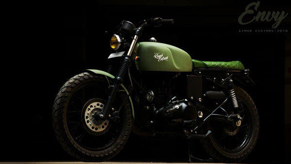 മട്ടിലും ഭാവത്തിലും തനി സ്ക്രാമ്പ്ളറെങ്കിലും എന്വിയെ കഫെ റേസറെന്ന് വിളിക്കാനാണ് ഐമോര് കസ്റ്റംസിന് താത്പര്യം. മാറ്റ് ഗ്രീന് നിറത്തോട് യോജിച്ച് നില്ക്കുന്ന കടുപ്പമാര്ന്ന പച്ചയിലാണ് പതുപതുത്ത ലെതര് സീറ്റ്.