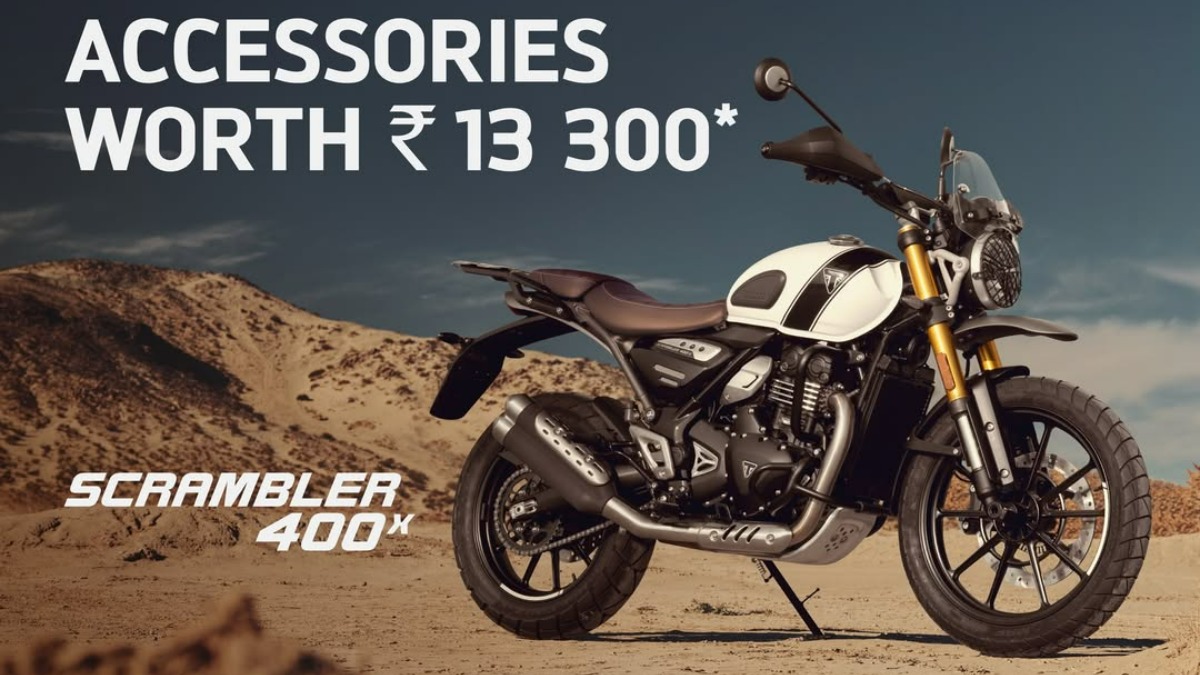 കൂടുതൽ ആളുകളെ ആകർഷിക്കുന്നതിനായി സ്ക്രാംബ്ലർ 400X മോഡൽ സ്വന്തമാക്കാനെത്തുന്നവർക്കായി കിടിലൻ സമ്മാനങ്ങൾ ഒരുക്കിയിരിക്കുകയാണ് ട്രയംഫ്. ഇയർ എൻഡ് ഓഫറുകളുടെ ഭാഗമായി ഈ 400 സിസി മോട്ടോർസൈക്കിൾ വാങ്ങുന്നവർക്ക് 13,300 രൂപ വിലയുള്ള സൗജന്യ ആക്സസറികളാണ് കമ്പനി നൽകുന്നത്. 2025 ഡിസംബർ ഒന്നിനും ഡിസംബർ 31-നും ബൈക്ക് വാങ്ങുന്നവർക്ക് മാത്രമായിരിക്കും ഈ ആക്സസറികൾ ഫ്രീയായി ലഭിക്കുക.